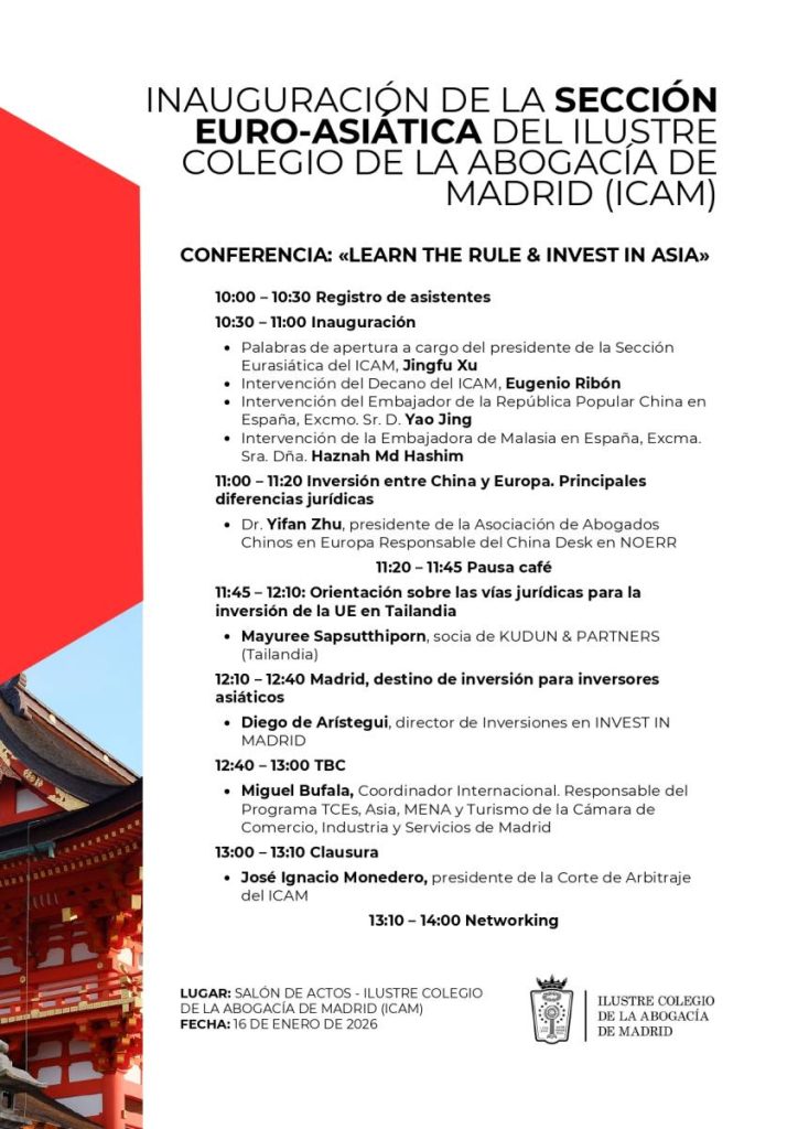 El Ilustre Colegio de la Abogacía de Madrid (ICAM) inaugurará el próximo 16 de enero de 2026,a las 10:30h., su nueva Sección Euro-Asiática, una iniciativa destinada a reforzar la especialización de la abogacía madrileña en las relaciones jurídicas, comerciales y de inversión entre Europa y Asia.
