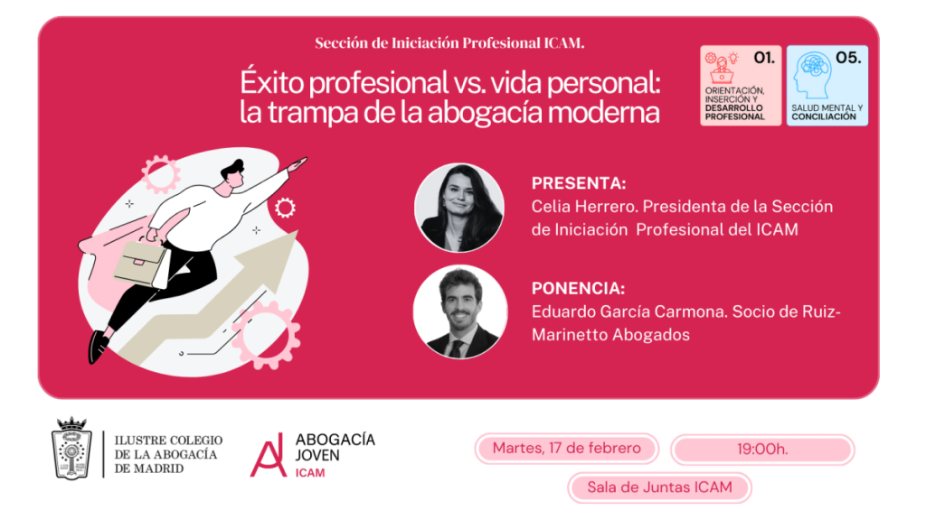 La sesión será presentada por Celia Herrero, presidenta de la Sección de Iniciación y coordinadora de Abogacía Joven ICAM, y contará con la intervención de Eduardo García Carmona, socio de Ruiz-Marinetto Abogados, quien impartirá la ponencia “Éxito profesional vs. vida personal: la trampa de la abogacía moderna”. Durante su exposición, García Carmona abordará los desafíos de la profesión, el modelo de excelencia y exigencia de los grandes despachos, y la importancia de gestionar los límites personales dentro de un entorno laboral altamente demandante.